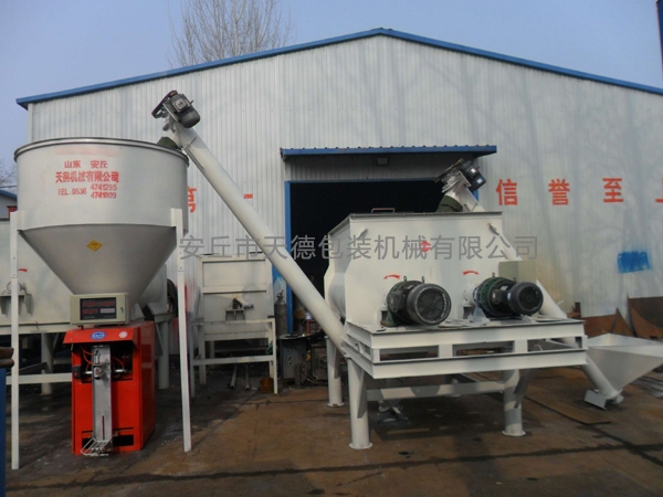 螺旋上料機小平臺式三軸高能攪拌機,卸料機,成品提升機,儲料倉,全自動計量包裝機,除塵器(選配),電器控制柜等組成。